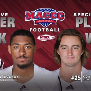 RAYMOND – BeSean McCray (Orlando, Fla.) and Connor Smith (Vicksburg) were tabbed as the Mississippi Association of Community Colleges Conference (MACCC) Football Players of the Week following their stellar performances in Hinds 18-16 victory over Jones College last Thursday (Oct. 15). Freshman quarterback BeSean McCray was named the MACCC Offensive Player of the Week. McCray completed 41 of his 74…