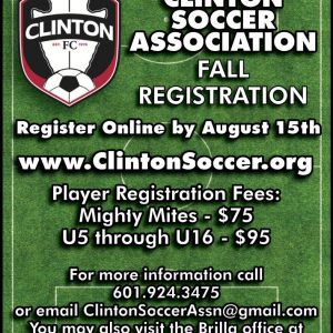 The Clinton Soccer Association announced its fall player registration for Mighty Mites and U5-U16. To register your child this year for Fall Soccer please visit https://www.clintonsoccer.org/Default.aspx?tabid=347219. Register online by August 15th, 2020! For more information call 601-924-3475 or email ClintonSoccerAssn@gmail.com. You may also visit the Brilla office at 402-A Cynthia Street in Clinton! See: Clinton Soccer…